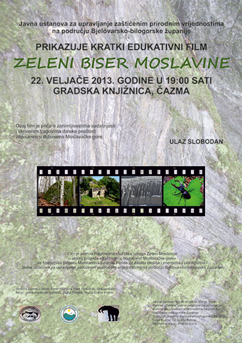 22. veljače 2013.g. u 19:00 sati u gradskoj knjižnici Čazma, Javna ustanova za upravljanje zaštićenim prirodnim vrijednostima na području Bjelovarsko-bilogorske županije prikazala je kratki edukativni film ZELENI BISER MOSALVINE.